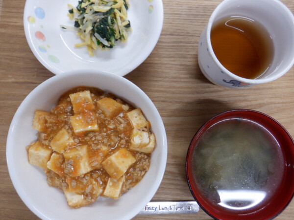 今日の給食は、厚揚げマーボー丼 もやしのナムル 春雨スープ です。 離乳食は、 マーボー風粥(全粥、人参、豚ひき肉) うわずみ 野菜のだし煮(キャベツ、ほうれん草) コロコロ野菜(大根、じゃが芋) です。