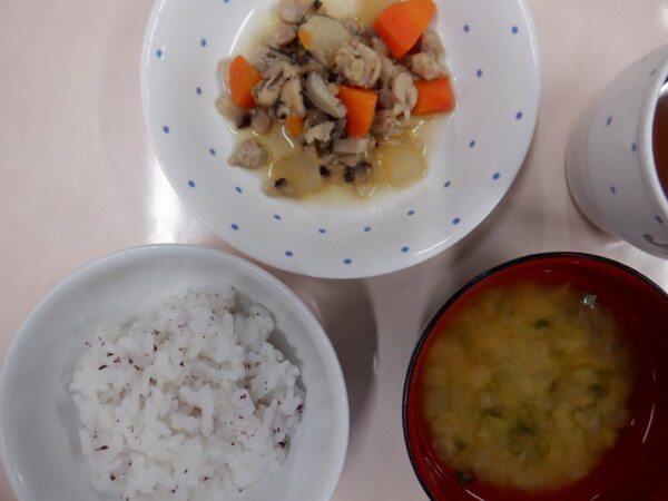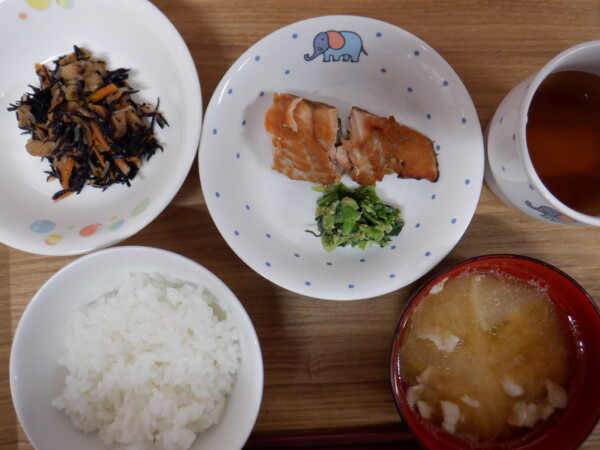今日の給食は、 ごはん 鮭の照り焼き ひじきの炒り煮 豚汁 です。 離乳食は、 軟飯 うわずみ 鮭の照り煮(鮭、小松菜、大根) 野菜の炒り煮(人参、じゃが芋) です。