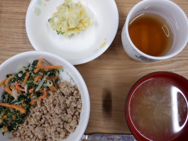 今日の給食は、 ビビンバ丼 スイートポテトサラダ 中華スープです。 離乳食は、 彩り粥(全粥、鶏ひき肉、人参、ほうれん草) うわずみ スイートポテトサラダ(さつま芋、玉ねぎ) スティック野菜(大根、じゃが芋) です。
