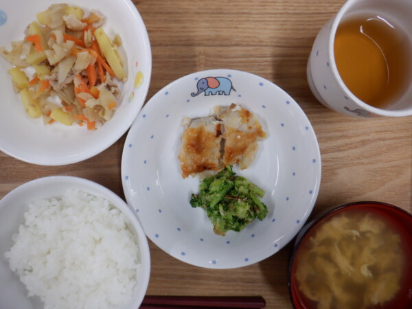 今日の給食は、 ごはん タラのみそマヨ焼き きんぴらごぼう かきたま汁 です。 離乳食は、全粥 うわずみ(キャベツ) タラの塩煮(タラ、ブロッコリー) きんぴら野菜(さつま芋、人参) です。