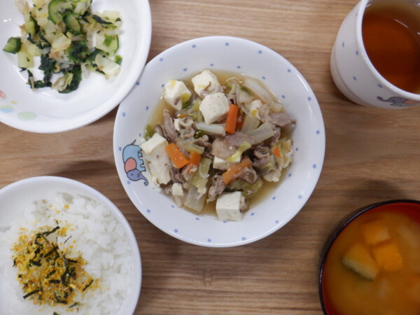 今日の給食は、 のりたまごはん すき焼き風煮 野菜のおかか和え みそ汁 です。 離乳食は、 全粥 うわずみ(かぼちゃ) すき焼き風煮(豚肉、人参、玉ねぎ、白菜) キャベツの和え物(キャベツ、ほうれん草) です。