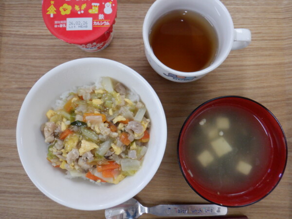 今日の給食は、 中華あんかけ丼 ヨーグルト わかめスープ です。 離乳食は、 あんかけ粥(全粥、白菜、人参、チンゲン菜) うわずみ(さつま芋) 鶏肉の醤油煮(鶏ひき肉、玉ねぎ) 大根サラダ(キャベツ、大根) です。