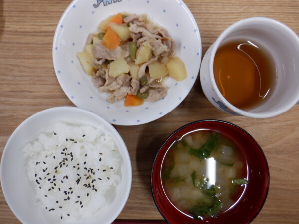 今日の給食は、ごま塩ごはん 肉じゃが みそ汁 です。 離乳食は、 軟飯 うわずみ 肉じゃが(豚肉、さつま芋、大根、人参) お浸し(キャベツ) です。