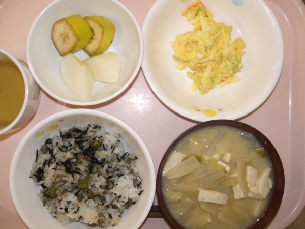 今日の給食は挽き肉とひじきの混ぜごはん・卵サラダ・けんちん汁・フルーツです。 離乳食は全粥・うわずみ・挽き肉とひじきの煮物・おかか和えです。