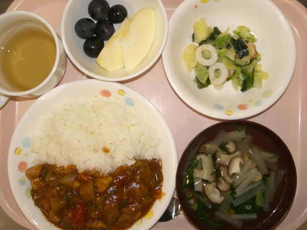 今日の給食は、チキンカレー、キャベツナムル、大根スープ、フルーツです。離給食は、全粥、大根スープ、鶏肉と野菜の煮物、煮浸しです。