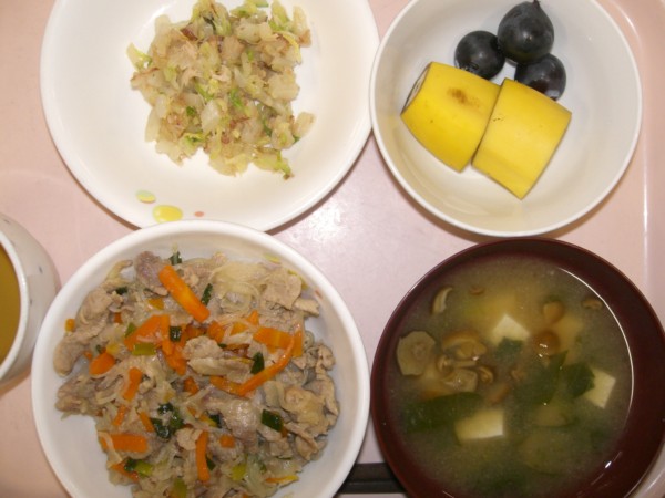 今日の給食は豚丼・和え物・みそ汁・フルーツです。 離乳食は豚丼・お浸し・うわずみ・フルーツです。