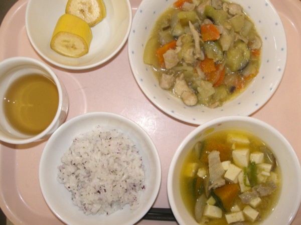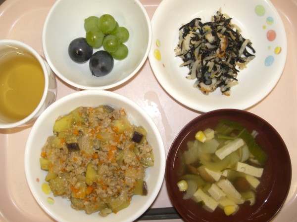 今日の給食は、大豆そぼろかけごはん、かぼちゃのおかか煮、なめこ汁、フルーツです。離乳食は、そぼろかけ粥、うわずみ、かぼちゃのおかか煮、フルーツです。