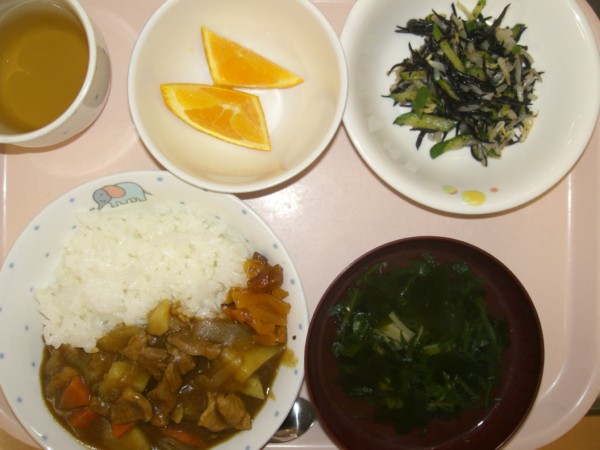 今日の給食は、カレーライス、中華和え、スープ、フルーツです。 離乳食は、全粥、豚肉と野菜の煮物、お浸し、スープです。