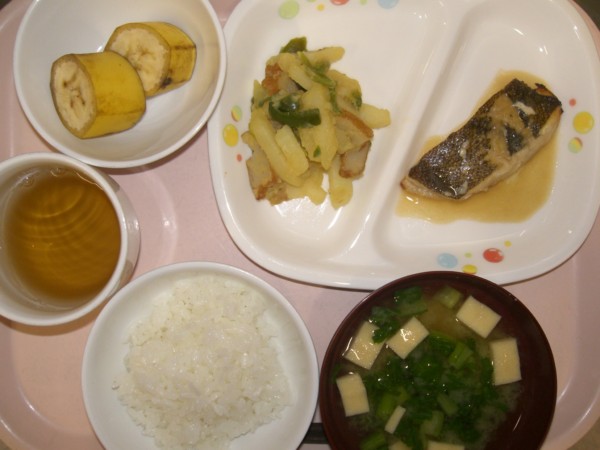今日の給食は、ごはん、かれいの煮つけ、じゃが芋の炒め煮、みそ汁、フルーツです。離乳食は、全粥、うわずみ、魚と野菜のあんかけ、じゃが芋の和え物です。