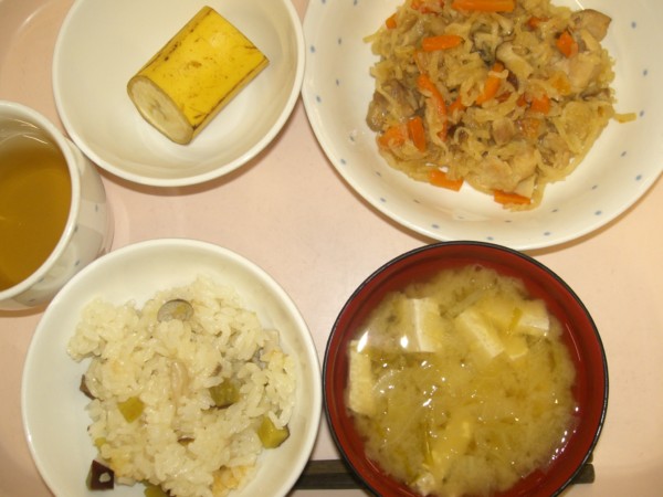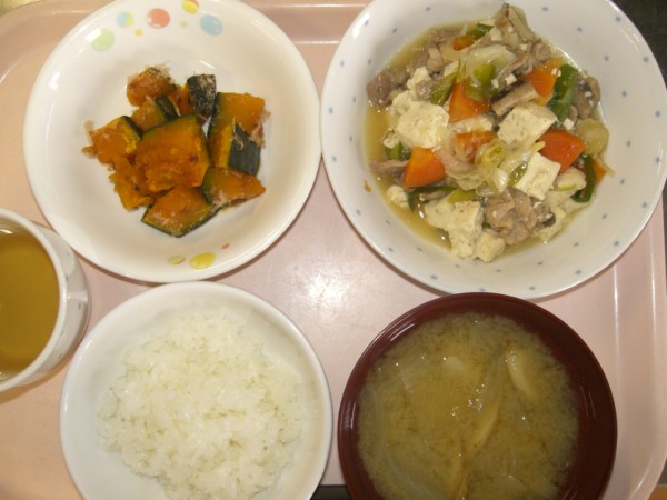 今日の給食は、ごはん、肉豆腐、かぼちゃのおかか煮、根菜汁です。 離乳食は、全粥、豚肉と野菜の煮物、かぼちゃスープ、フルーツです。