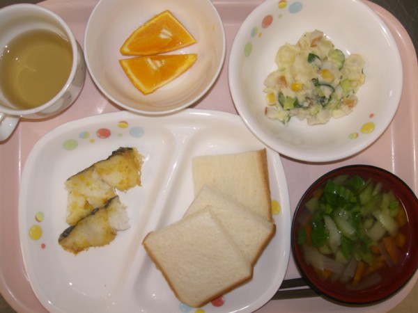 今日の給食は、食パン、魚のカレー風味揚げ、ポテコロサラダ、野菜スープです。 離乳食は、全粥、煮魚、人参スティック、野菜スープです。