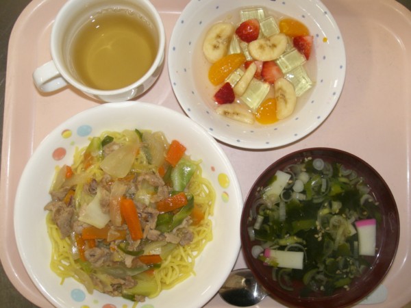 今日の給食はあんかけやきそば、フルーツポンチ、中華スープです。 離乳食は全粥、うわずみ、豚肉と野菜の煮物、煮浸しです。