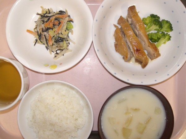 今日の給食は、ごはん、鶏の照り焼き、ひじきのマヨ和え、じゃが玉スープです。離乳食は、全粥、ささみと野菜の煮物、ひじきの煮物、ポテトスープです。