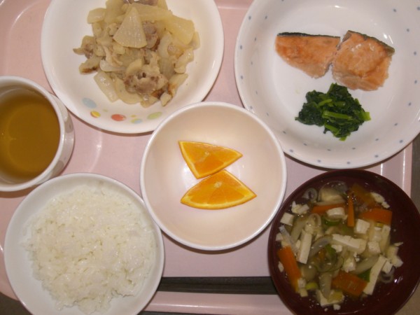 今日の給食は、ごはん、焼き魚、大根とちくわのみそ煮、けんちん汁、フルーツ(オレンジ)です。 離乳食は、全粥、うわずみ、しらすと野菜の煮物、大根スティックです。