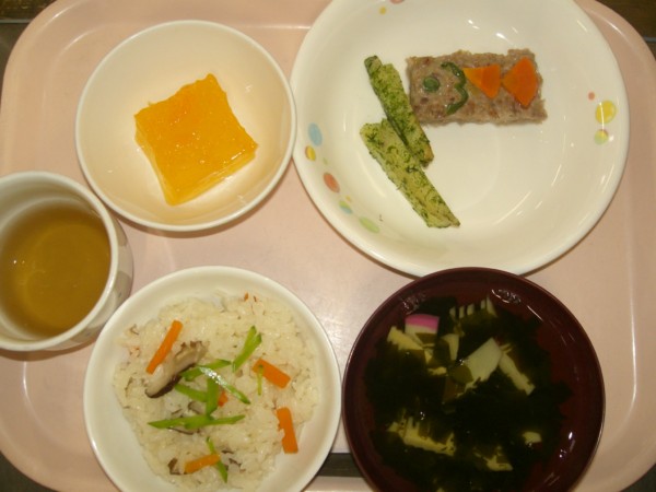 今日の給食は、端午の節句献立です。 炊き込みごはん、鯉のぼりバーグ、若竹汁、青のりポテト、ゼリーです。 離乳食は、全粥、ミニハンバーグ、お浸し、わかめスープ、フルーツです。
