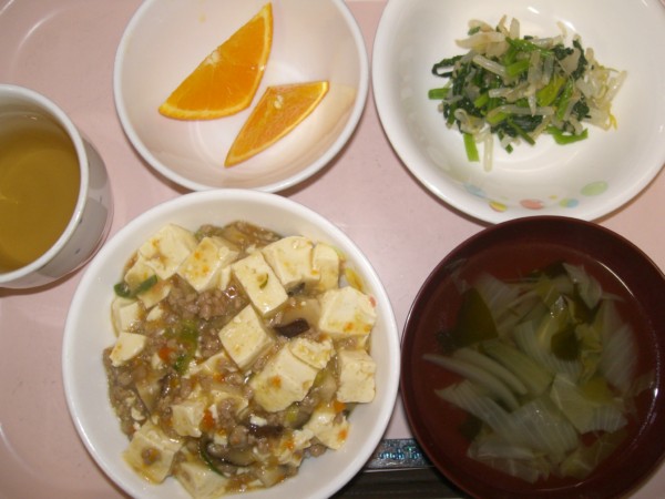 今日の給食は、マーボー丼、ナムル、わかめスープ、フルーツです。 離乳食は、全粥、うわずみ、挽肉と野菜の煮物、煮びたしです。