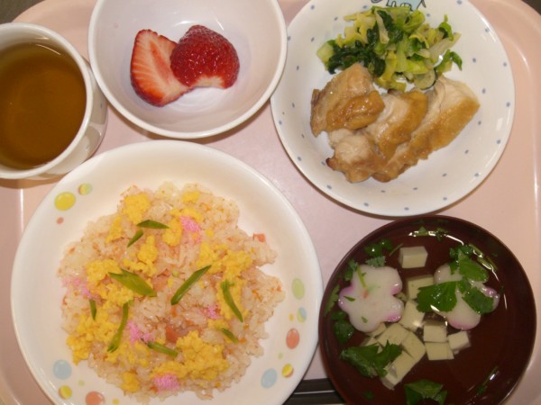 今日はひなまつり集会があったので、特別メニューです。三食ごはん、鶏の照り焼き、おかか和え。すまし汁、フルーツです。離乳食は三食粥、ささみの煮物、うわずみ、おかか和え、フルーツです。