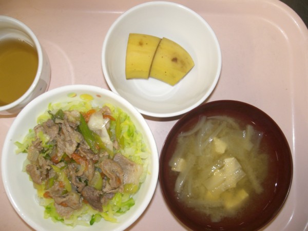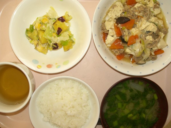 今日の給食は、ごはん、肉豆腐、さつま芋サラダ、みそ汁です。 離乳食は、全粥、うわずみ、しらすの野菜あんかけ、さつま芋の煮びたしです。