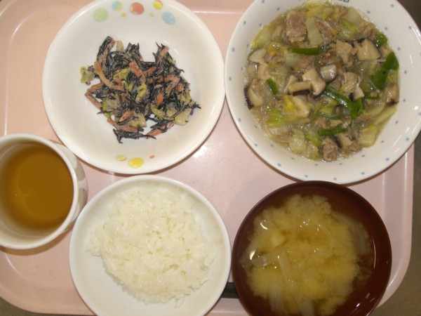 今日の給食は、ご飯、豚肉と白菜の中華煮、ひじきサラダ、じゃがたま汁です。 離乳食は、全粥、うわずみ、鶏肉と野菜のあんかけ、ひじきとじゃが芋の和え物です。