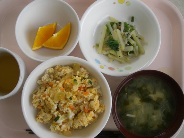 今日の給食は、ふわたま丼、ごま和え、フルーツ、みそ汁です。 離乳食は、全粥、鶏挽きと野菜の煮物、和え物、うわずみです。