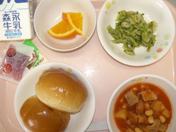 今日の給食は、バターロールパン、ポークビーンズ、ブロッコリーナムル、フルーツです。 離乳食は、全粥、うわずみ、しらすの野菜あんかけ、さつま芋の煮びたし、フルーツです。