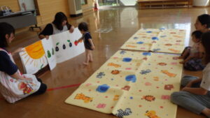 「♪キャベツの中から」の手遊びを行った後、はらぺこあおむしの大型絵本を見ました😊