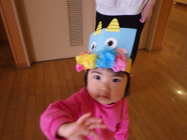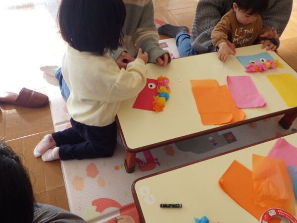 お花紙をクシャクシャにして髪を付けたり、目をクレヨンで描いたり目やほっぺ、ツノを貼って完成させていました!