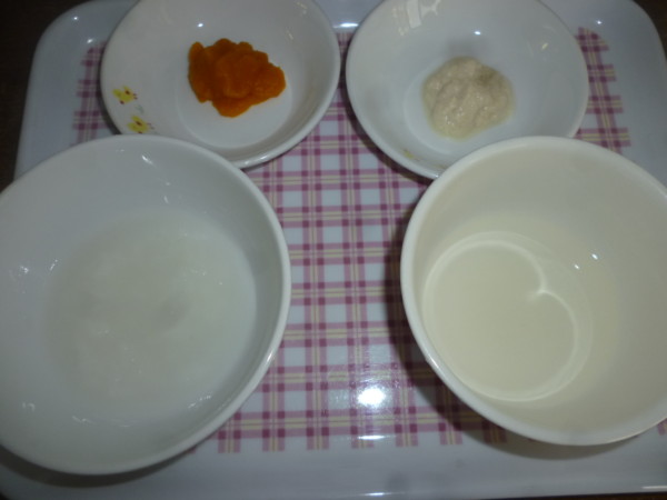 離乳食(初期)は重湯(粒あり)、かぼちゃペースト、豆腐ペースト、うわずみです。