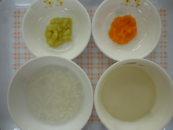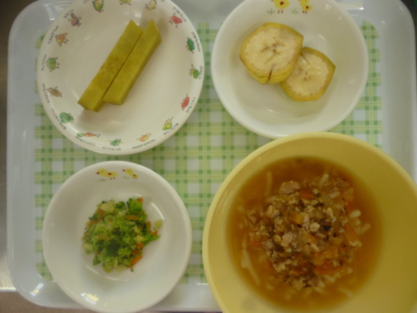 今日の給食はミートソーススパゲティ、ブロッコリーのサラダ、じゃが芋のスープ、バナナです。離乳食(中期)は7分粥、人参、さつま芋ペースト、うわずみです。離乳食(後期)は煮込みうどん、さつま芋スティック、ブロッコリーサラダ、バナナです。