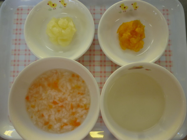 今日の給食はちらしご飯、鶏のから揚げ、菜の花と手まり麩のすまし汁、いちごです。アレルギー食(卵)のちらしご飯は錦糸卵除去です。離乳食(中期)は人参粥、じゃが芋、かぼちゃペースト、うわずみです。