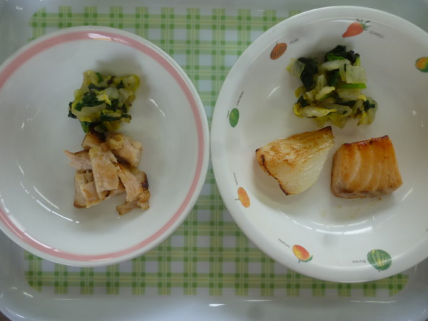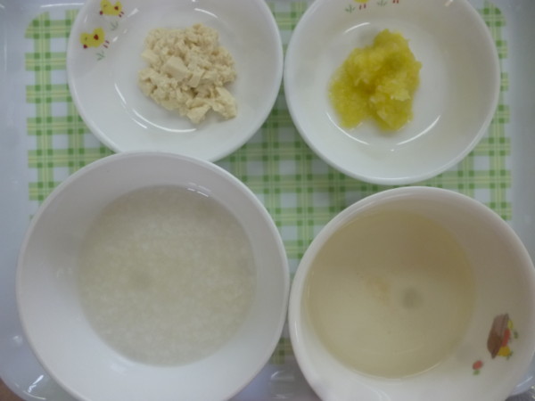 今日の給食は竹の子の炊き込みご飯、カレイの塩焼き、白菜の海苔和え、豚汁、チーズキャンディです。アレルギー食(カレイ)は鶏肉の塩焼きか鮭の塩焼きです。離乳食(中期)は7分粥、豆腐、キャベツペースト、うわずみです。