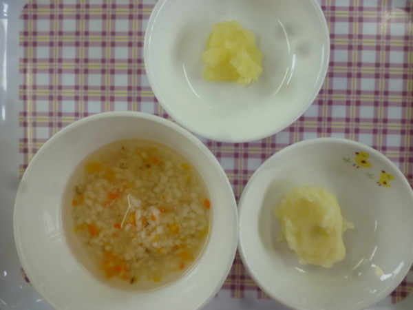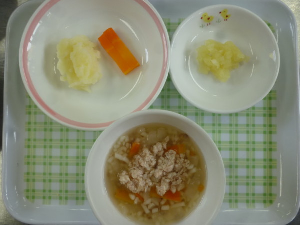 今日の給食はけんちんうどん、ポテトサラダ、りんご、アーモンドフィッシュ(以上児)です。離乳食(中期)は煮込みうどん、きんとん、煮りんごです。離乳食(後期)は煮込みうどん、きんとん、人参スティック、煮りんごです。
