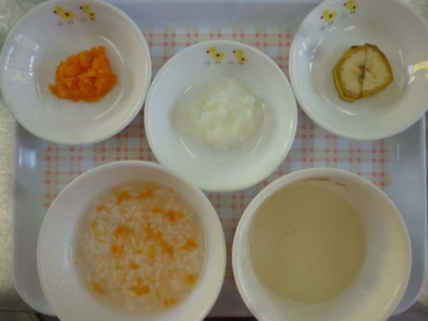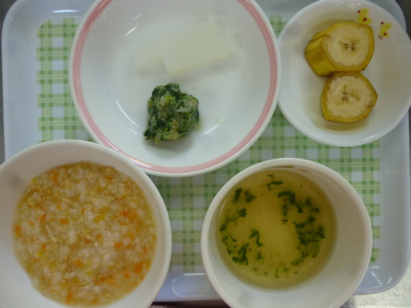 今日の給食はそぼろ丼、ほうれん草ともやしの中華和え、そうめん汁、バナナです。未満児のみチーズキャンディ付きです、アレルギー食(乳)はミニゼリーです。離乳食(中期)は人参粥、人参、大根ペースト、うわずみ、バナナです。離乳食(後期)は、そぼろ粥、ほうれん草ともやしのおひたし、大根スティック、そうめん汁、バナナです。