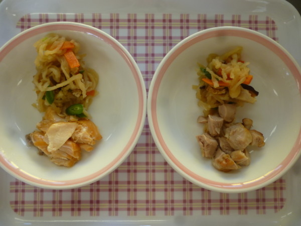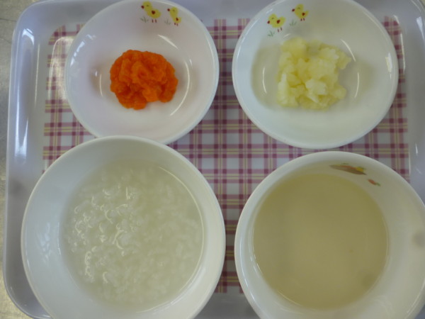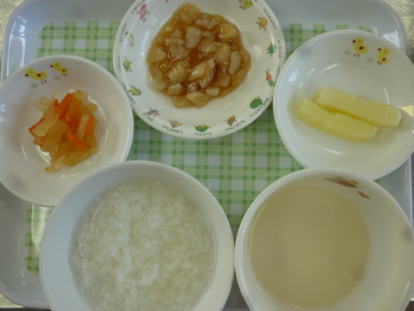 今日の給食はご飯、さんまの香味焼き、切干大根の煮付け、白菜のみそ汁です。アレルギー食(青魚)は鮭の香味焼きか鶏もも肉の照り焼きです。離乳食(中期)は7分粥、人参、じゃが芋ペースト、うわずみです。離乳食(後期)は全粥、タラの煮付け、大根の煮物、じゃが芋スティック、みそ汁です。