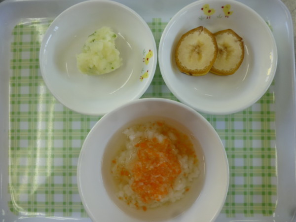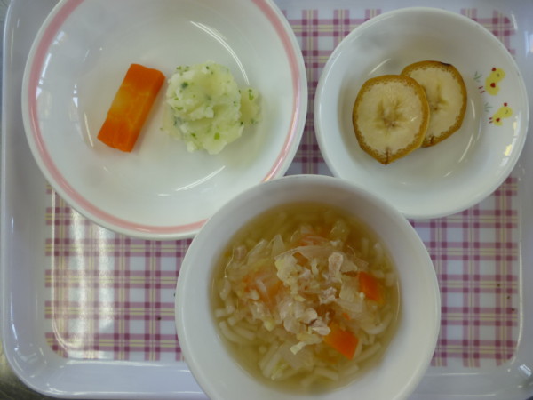 今日の給食は焼きそば、じゃが芋のチーズ焼き、(アレルギー食・乳はチーズ除去)、もやしのスープ、オレンジです。離乳食(中期)は煮込みうどん、マッシュポテト、バナナです。離乳食(後期)は煮込みうどん、マッシュポテト、人参スティック、バナナです。