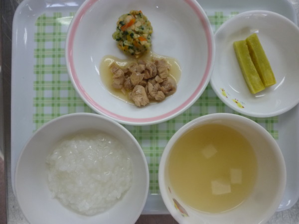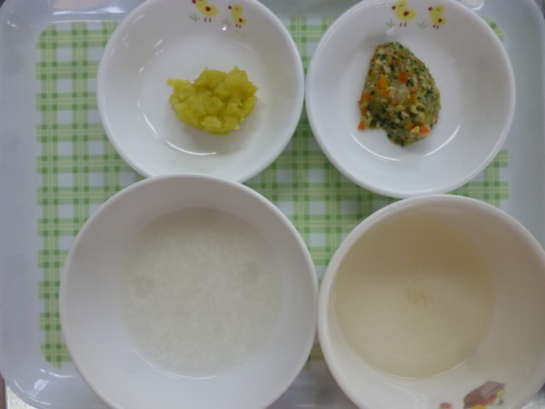 今日の給食はご飯、鮭のバターしょうゆ焼き、納豆和え、あおさのみそ汁です。アレルギー食(魚)は鶏肉の照り焼きです。離乳食(中期)は7分粥、さつまいも甘煮、納豆和え、うわずみです。離乳食(後期)は全粥、鶏肉の照り煮、納豆和え、さつま芋スティク、豆腐のみそ汁です。