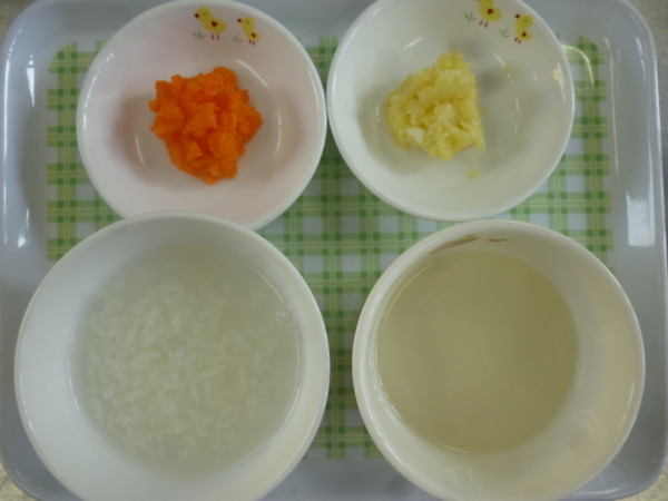 今日の給食はカレーうどん、ツナサラダ、チーズキャンディです。アレルギー食(乳)は星の王子様カレー使用、ミニゼリーです。離乳食(中期)は7分粥、人参、キャベツペースト、うわずみです。