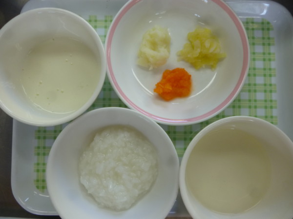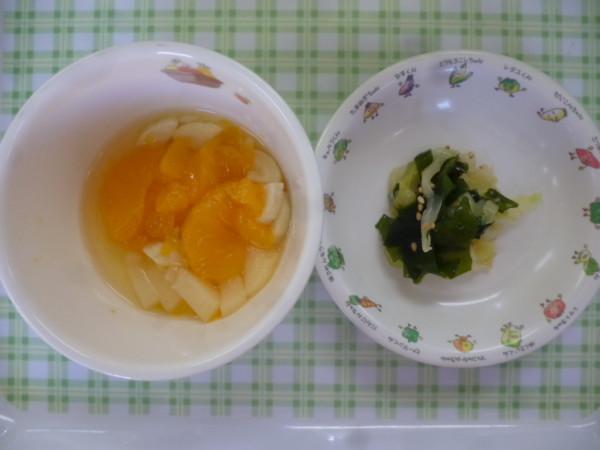 今日の給食は野菜たっぷりマーボー丼、キャベツとわかめのナムル、きのこスープ、フルーツヨーグルトです。アレルギー食(乳)のデザートはフルーツ、アレルギー食(魚)の副菜はキャベツとわかめの和え物です。離乳食(中期)は全粥、人参キャベツじゃがいもペースト、うわずみ、ヨーグルトです。