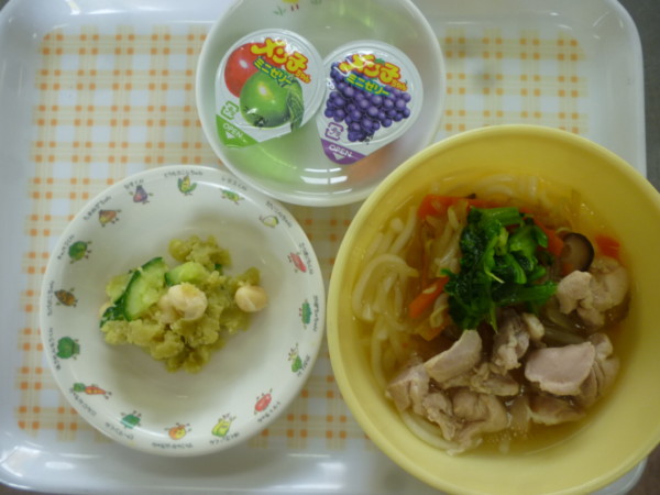 今日の給食は鶏塩うどん、さつま芋サラダ、りんご、チーズキャンディ(ひよこ、りす、こあら)、小魚アーモンド(きりん、ぞう)、アレルギー食