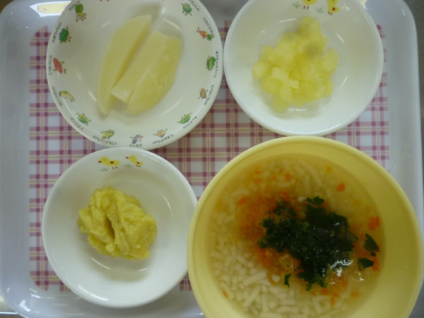 (乳)はミニゼリーです。アレルギー食(魚、卵)はなるとなし、アレルギー食(乳、卵)のサラダはスキムミルク、マヨネーズ除去です。離乳食(後期)は鶏だしうどん、さつま芋のマッシュ、じゃが芋スティック、りんごのコンポートです。