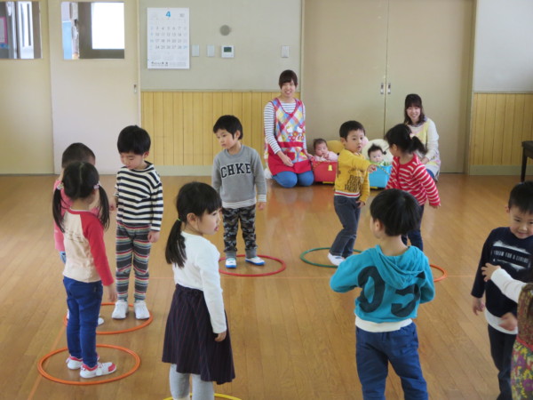 ホールでピアノに合わせて体を動かして遊んでいるきりん組さん。たまご組さんもお兄さん、お姉さんの姿を見て楽しそうです。