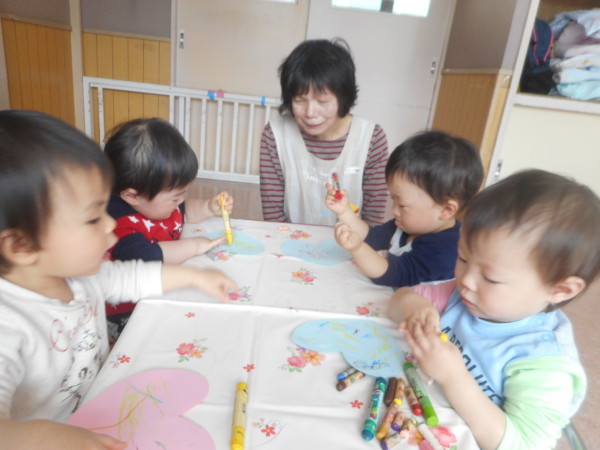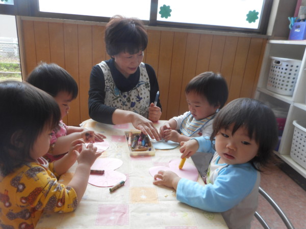 今日は製作あそびをしました。ハート型の色紙に、好きな色のクレパスを選んで、クルクル、ギュッギュッ…楽しそうに描いていました。