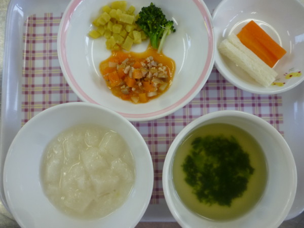 今日の給食は食パン、鶏と野菜のトマト煮、さつま芋サラダ、ほうれん草スープです。離乳食(後期)はパン粥、鶏と野菜のトマト煮、さつま芋の甘煮、ブロッコリーのおひたし、人参スティック、食パンスティック、ほうれん草スープです。