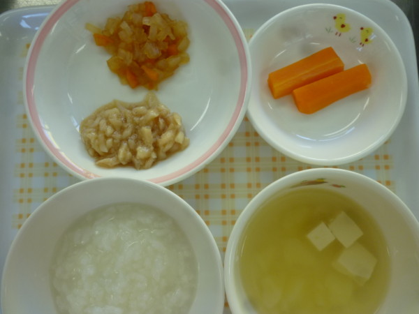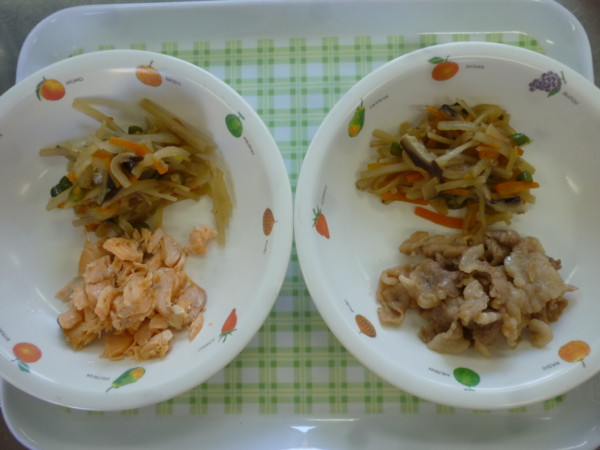今日は、サバの漬け焼き、野菜きんぴら、あおさのみそ汁、ご飯です。離乳食初期は、おもゆ、うわずみです。離乳食後期は全粥、タラの煮つけ、野菜きんぴら、人参ステッィク、じゃが芋と豆腐のみそ汁です。アレルギー食(サバ、魚)は鮭と豚肉で対応しています。