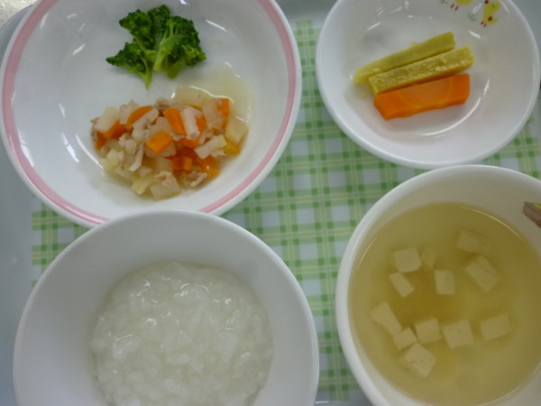 今日の献立は、ごはん、肉じゃが、ブロッコリーの胡麻和え、豆腐とわかめのみそ汁です。離乳食(後期)は、全粥、肉じゃが、ブロッコリーのおひたし、人参スティック、さつま芋のスティック、豆腐のみそ汁です。離乳食(初期)はおもゆ、うわずみです。