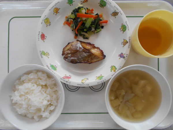 今日の献立は、ごはん、サバの漬け焼き、小松菜の和え物、茄子と豆腐の味噌汁です。アレルギー食(魚)は豚肉の漬け焼きに変更しています。アレルギー食(青魚)は鮭の漬け焼きに変更しています。