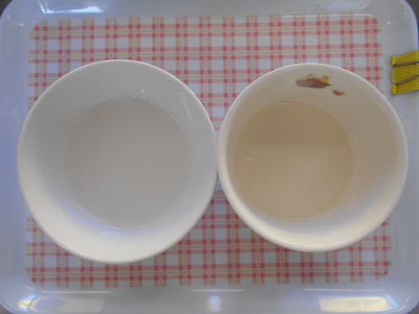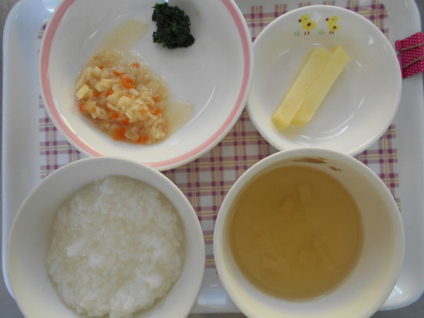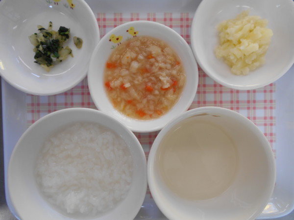 離乳食(後期)は全粥、カレイの野菜あんかけ、小松菜のおひたし、豆腐の味噌汁、じゃが芋スティックです。離乳食(初期)はおもゆ、うわずみです。離乳食(中期)は七倍粥、うわずみ、カレイの野菜あんかけ、キャベツと小松菜のおひたし、じゃが芋です。