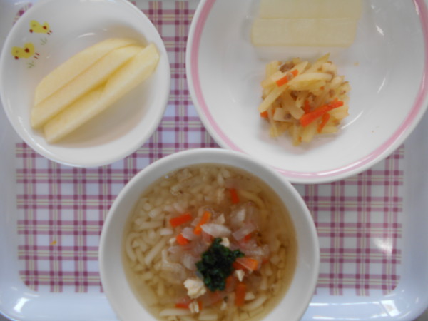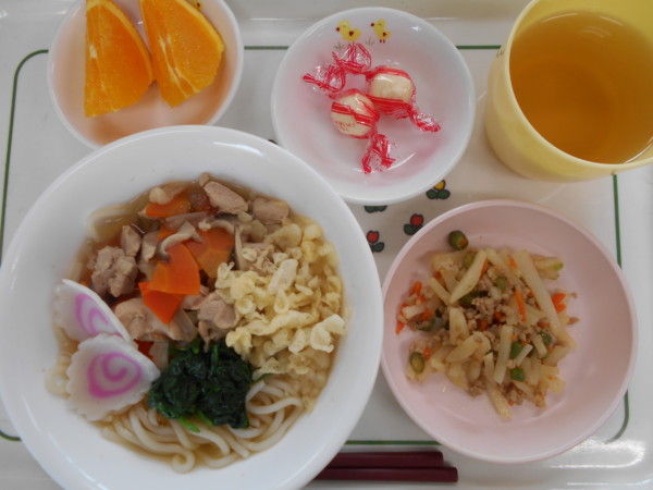今日の献立は、たぬきうどん、ポテトきんぴら、オレンジ、チーズキャンディです。アレルギー食(魚)はなるとを除去、アレルギー食(乳) はチーズキャンディなしです。離乳食(後期)は煮込みうどん、ポテトきんぴら、大根スティック、りんごです。