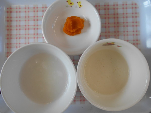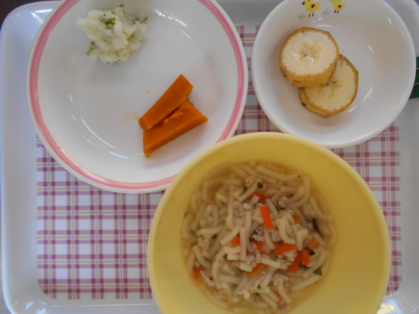 今日の献立は、味噌煮込みうどん、じゃが芋のマヨネーズ焼き、柿、小魚アーモンド(きりんくみ、ぞうくみ)、チーズキャンディ(こあらくみ)です。アレルギー食(魚)はなるとを除去、アレルギー食(卵)は塩と砂糖の味付けにしています 。離乳食(後期)は味噌うどん、じゃが芋の青のりマッシュ、かぼちゃスティック、バナナです。離乳食(初期)おもゆ、うわずみ、かぼちゃです。