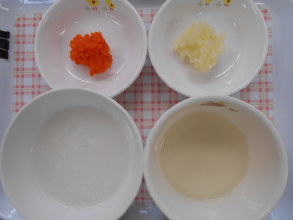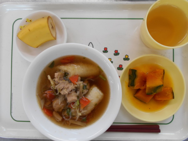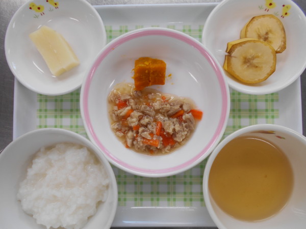 今日の献立は、きりたんぽ、かぼちゃの甘煮、バナナです。離乳食(後期)は全粥、鶏肉の煮物、カボチャの甘煮、スープ、じゃが芋スティックです。離乳食(初期)はおもゆ、うわずみ、じゃが芋、人参です。